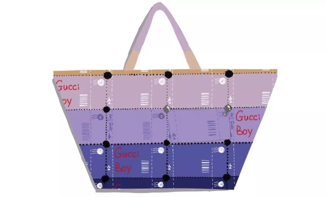 以郵票以齒空相連成為整體為設計思路,以當季流行色紫橙漸變為主要配色。這是由許多明信片相連組成的紋樣,明信片記錄著遠方朋友祝福、思念和美好,而隨著微信、QQ的沖擊,越來越少人會想到寫信,這是對從前那個很慢的時代的追念。而明信片上隨機出現印有“Gucci Boy”的字符,是時下社會風氣衍生出來的價值觀,無論正確與否,都值得我們深思。